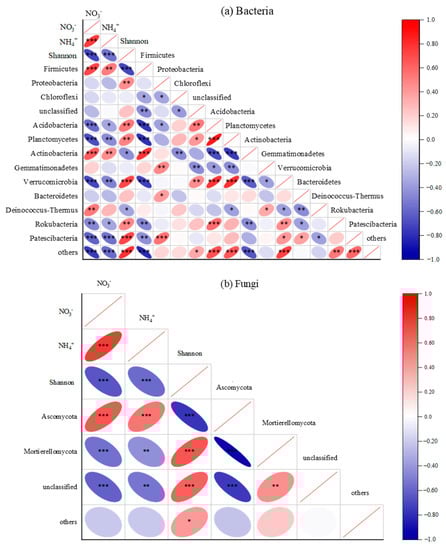 Relationship between bacterial (a) and fungal (b) abundance in phylum taxa and soil parameters (n = 36). Red indicates a positive correlation, whereas blue indicates a negative correlation. *, ** and *** indicate significant effects at p = 0.05, 0.01 and 0.001, respectively.