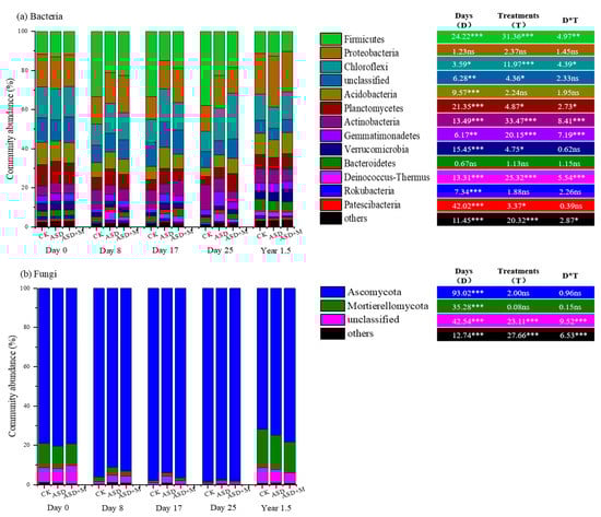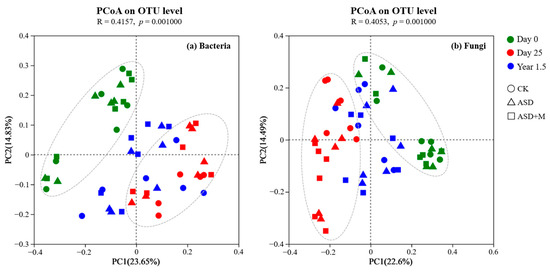 The drastic changes in soil environmental conditions caused by the ASD not only eliminated pathogenic microorganisms but also inhibited the growth and reproduction of soil nontarget organisms [22,23,24], leading to a decline in the diversity of soil bacteria and fungi, as shown in our study (Figure 1; p < 0.05). In addition, the bacterial and fungal diversity fully returned to pre-ASD levels after 1.5 years (Figure 1).