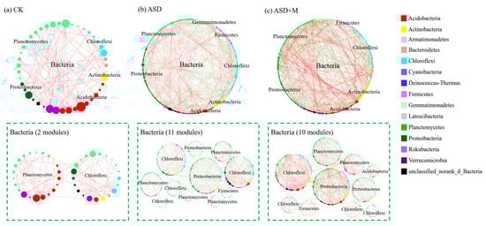 Co-occurrence pattern of the bacterial community and co-occurrence pattern of each subnetwork in CK (a), ASD (b) and ASD+M treatments ((c); n = 24). Subnetworks were generated for each treatment from the network by preserving nodes and edges presented (nodes ≥ 10). Node colours signify different phyla. Bigger nodes represent the dominant taxa with a high degree of nodes. The red and green lines represent positive and negative correlations, respectively. Data were fitted using linear regression and assessed by Spearman’s rank correlation ρ.