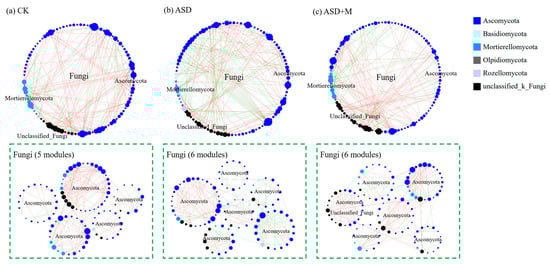 Co-occurrence pattern of the fungal community and co-occurrence pattern of each subnetwork in CK (a), ASD (b) and ASD+M treatments ((c); n = 24). Subnetworks were generated for each treatment from the network by preserving nodes and edges presented (nodes ≥ 10). Node colours signify different phyla. Bigger nodes represent the dominant taxa with a high degree of nodes. The red and green lines represent positive and negative correlations, respectively. Data were fitted using linear regression and assessed by Spearman’s rank correlation ρ.