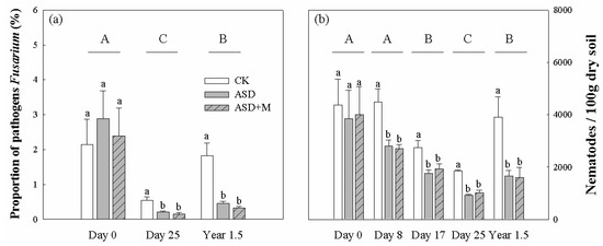 The average relative abundance of Fusarium, a pathogen that causes tomato wilt, decreased significantly from 2.5% to 0.3% at the end of the ASD period (Day 25) compared to Day 0 (Figure 7a; p < 0.05). However, the average relative abundance of Fusarium in all treatments rebounded at 1.5 years after the ASD, with the largest rebound observed in the control treatment, which recovered to the level before the experiment and was three to four times higher than that in the ASD and ASD+M treatments (Figure 7a; p < 0.05). The average number of nematodes per 100 g of dry soil also significantly decreased from 4079 on Day 0 to 1268 on Day 25 (Figure 7b; p < 0.05). However, soil nematodes in all treatments rebounded at 1.5 years after the ASD, with the control treatment recovering to the original level before the experiment, which was significantly higher than that of the ASD and ASD+M treatments (Figure 7b; p < 0.05).