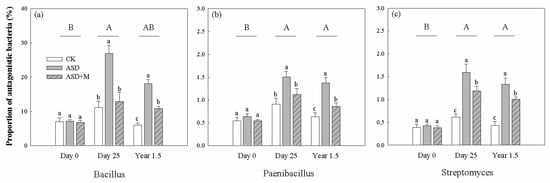 The relative abundance of the antagonistic bacteria Bacillus, Paenibacillus and Streptomyces significantly increased on Day 25 compared with that before the experiment (Day 0) and fell back at 1.5 years after the ASD (Figure 8a, p < 0.05). Before the experiment, no significant difference was found in the relative abundance of Bacillus between the three treatments. However, the relative abundance of Bacillus in the ASD treatment was significantly higher than that in the CK and ASD+M treatments on Day 25 and at 1.5 years. The antagonistic bacteria Paenibacillus and Streptomyces with relative abundances greater than 1% at the genus level showed similar trends to Bacillus (Figure 8b,c). Moreover, a significant negative relationship of relative abundance of Fusarium was detected with the antagonistic bacteria Bacillus, Paenibacillus and Streptomyces, respectively (Figure 9).