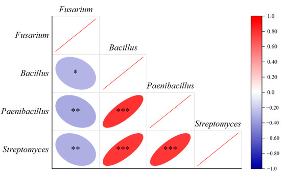 Relationship between relative abundance of pathogen (Fusarium) and antagonistic bacteria (Bacillus, Paenibacillus, Streptomyces) in genus taxa (n = 72). Red indicates a positive correlation, whereas blue indicates a negative correlation. *, ** and *** indicate significant effects at p = 0.05, 0.01 and 0.001, respectively.