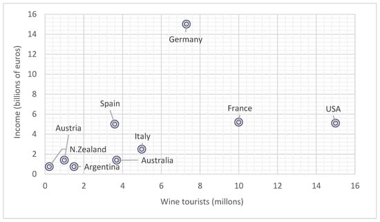 Wine tourists and wine tourism revenues in main countries (2019). Source: Own elaboration with data from Vins du Monde (Accueil (2021) Vins du monde. Available at: https://www.vinsdumonde.fr/ (accessed on 20 March 2023)).