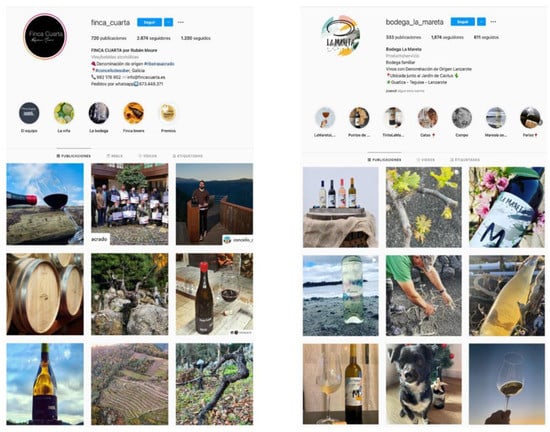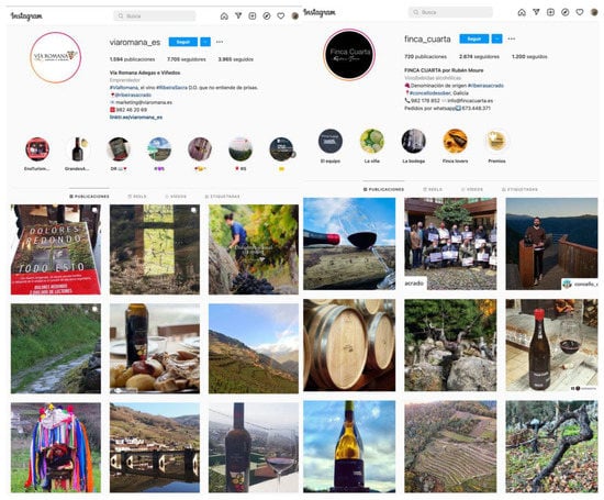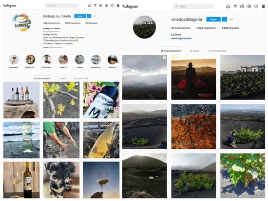 The case that concerns the present research focuses on the presence of wineries on Instagram. In this regard, of the 96 registered in the Ribeira Sacra Designation of Origin, 22.9%, i.e., 22 wineries, have a presence on this social network; on the other hand, in the Lanzarote territory, 14 of the 21 wineries, 66.7%, use this social network. Figure 4 and Figure 5 shows an example of the use of Instagram by two wineries.