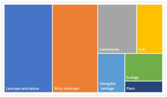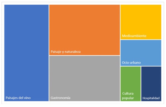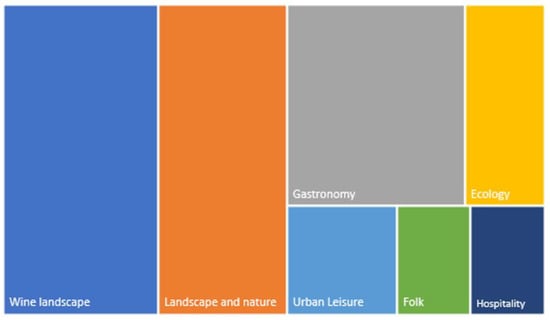As shown in Figure 6, the Instagram accounts of the 22 wineries with a presence in this network show two tourist attractions in their publications; some 20 accounts show landscape and nature, and another 19 show the wine landscape. Other categories include gastronomy, with nine profiles showing these attractions, popular culture, with six, and intangible heritage and ecology, with five.
