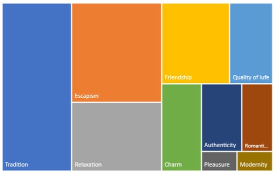 Figure 8 shows the analysis of the wineries of the Ribeira Sacra AO and the transmission of emotional values through their Instagram profiles. Tradition appears as the dominant category, with 17 profiles that present this value. Tranquillity, with 13, relaxation, with nine, or friendship, with eight, are also values that are implied through the profiles.