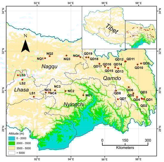 A total of 31 populations of E. nutans were sampled from Eastern Tibet (Figure 1, sampling information was listed in Supplementary Table S1), including Qamdo (QD), Nyingchi (NC), Lhasa (LS), and Nagqu (NQ), with 10 individuals per population, a distance of at least 5 m was maintained between each individual to avoid sampling similar genotypes. The sample seeds were planted in the experimental field at the Sichuan Academy of Grassland Sciences (latitude: 32.78° N; longitude: 102.54° E; altitude: 3502 m) in November 2018. In the following year, fresh leaf tissues from 10 individuals per population were mixed in equal amounts, dried in zip-lock plastic bags containing silica gel, and stored for DNA extraction. Total genomic DNA was extracted using a DP350 Plant DNA kit (Tiangen Biotech Co., Ltd., Beijing, China) following the manufacturer’s instructions. The quality and concentration of the extracted DNA were evaluated using 1% agarose gel electrophoresis and NanoDrop-Lite (Thermo Scientific, Waltham, MA, USA). The DNA was then diluted to a concentration of 10 ng/μL and stored at −20 °C.