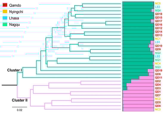 Population structure of 31 Elymus nutans accessions based on UPGMA and Bayesian clustering (K = 2). All accessions were grouped into two clusters. The accession codes with red, yellow, blue, and green indicate that these accessions were collected from Qamdo, Nyingchi, Lhasa, and Nagqu, respectively. All accessions colored based on the sample origins were divided into two UPGMA clusters and STRUCTURE subgroups.