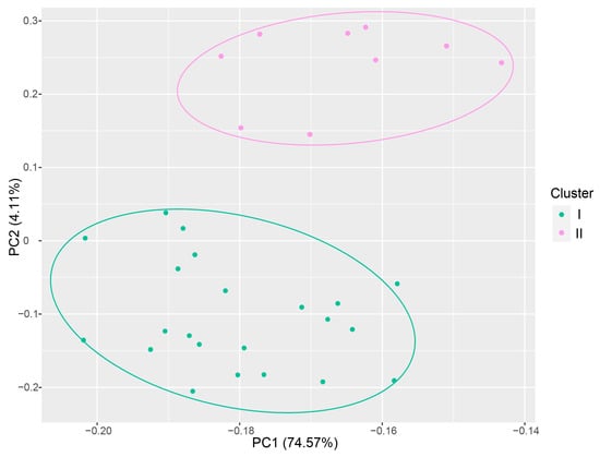 Nei–Li’s similarity coefficients were calculated to examine the genetic relationships among the 31 accessions. The coefficients ranged from 0.554 (between QD1 and NQ1) to 0.895 (between QD16 and QD17), with an average of 0.729. We found that the accessions collected from Qamdo showed the highest levels of Nei’s genetic diversity (H = 0.46) and Shannon information index (I = 0.31), while those from Lhasa had the lowest levels of both metrics (H = 0.19 and I = 0.17; see Supplementary Table S4). Furthermore, a UPGMA dendrogram was constructed based on genetic similarity, which revealed that the 31 germplasm resources were separated into two clusters (Figure 2). However, accessions from the same region were not grouped into the same class. Cluster I consisted of 22 accessions, with 12 from Qamdo, three from Nyingchi, and all from Lhasa and Nagqu, while Cluster II contained nine accessions from Qamdo (7) and Nyingchi (2). Based on the Bayesian model and delta K values, K = 2 was unambiguously the most likely number of subgroups (Supplementary Figure S1), and the results of the STRUCTURE analysis when K = 2 were consistent with the two UPGMA classes identified (Figure 2). In addition, PCA indicated that all 31 accessions could also be divided into two groups, in agreement with the aforementioned results (Figure 3).