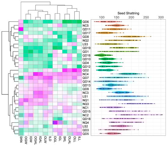 UPGMA cluster of 31 Elymus nutans populations based on 13 inflorescence phenotypic traits and corresponding seed-shattering values, the clustering results are shown on the left and the right plot shows the corresponding drop grain properties of each population. SKN, spikelet number; SKL, spikelet length; OGL, outer glume length; OGW, outer glume width; OGAL, outer glume awn length; IGL, inner glume length; IGW, inner glume width; IGAL, inner glume awn length; OLL, outer lemma length; OLW, outer lemma width; OLAL, outer lemma awn length; ILL, inner lemma length; ILW, inner lemma width.