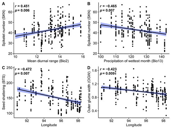 In addition, Pearson correlation analysis was performed to evaluate the influence of environmental factors on the phenotypic characteristics. The analysis included longitude (Lon), latitude (Lat), altitude (Alt), 19 bioclimatic variables (Bio1–19), 13 inflorescence phenotypic traits, and the BTS of seeds (as shown in Supplementary Figure S2). The three variables were significantly correlated with the inflorescence characteristics (Figure 5). Specifically, SKN was positively correlated with the mean diurnal range (r = 0.451, Figure 5A) and negatively correlated with the precipitation of the wettest month (r = −0.465, Figure 5B). Furthermore, BTS and OGW were negatively correlated with Lon (r = −0.472 and −0.423, Figure 5C,D, respectively).