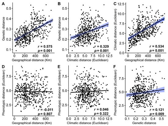 Regression of genetic, phylogenetic, geographical, and climatic distance among all population pairwise comparisons. (A) Regression of geographical and genetic distance. (B) Regression of climatic and genetic distance. (C) Regression of geographical and climatic distance. (D) Regression of geographical and phylogenetic distance. (E) Regression of climatic and phylogenetic distance. (F) Regression of genetic and phylogenetic distance.