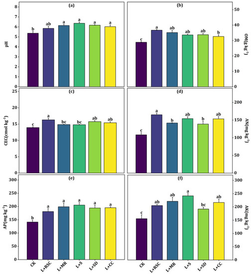 Effect of LOM on soil pH (a), OM (b), CEC (c), AN (d), AP (e), and AK (f) of A. selengensis. All values are means of three replicates with error bars indicating the standard error. Different lowercase letters show significant variability among treatments (p < 0.05).