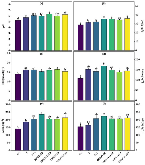 All LOM treatments increased soil OM significantly (p < 0.05) (Figure 1b). Furthermore, the L + RSC treatment increased OM by 27.10%, and the corresponding values under L + MR, L + SD, L + S, and L + CC were 21.68%, 16.84%, 16.38%, and 12.92%, respectively. OM contents in soil were significantly higher following treatment with LSF than in the control treatment (Figure 2b). The OM content increased significantly (p < 0.05) with all treatments except F, while the 70%F + L + SD treatment increased OM markedly by 24.34%.