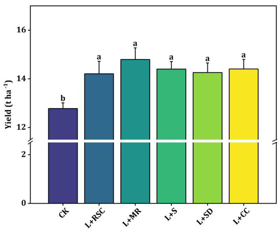 The A. selengensis plants treated with LOM and LSF treatments grew normally, and their yields are illustrated in Figure 3 and Figure 4 compared with the control soil; all LOM treatments increased yield significantly (p < 0.05), and the L + MR treatment increased the yield the most, by 15.76%. The corresponding values for L + RSC, L + S, L + SD, and L + CC were 11.17%, 12.68%, 11.57%, and 12.71%, respectively (Figure 3).
