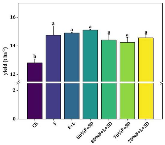 Inorganic compound fertilizers also increased A. salengensis yield significantly (p < 0.05) (Figure 4), with the greatest increase observed under 80%F + SD, at 17.94%. The corresponding increases under F, F + L, 80%F + L + SD, 70%F + SD, and 70%F + L + SD were 15.12%, 16.31%, 12.47%, 11.11%, and 13.65%, respectively.