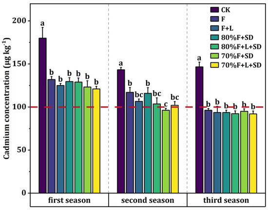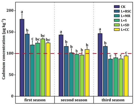 Effect of LOM on Cadmium concentration in edible parts of A. selengensis over three seasons. All values are means of three replicates with error bars indicating the standard error. Different lowercase letters show significant variability among treatments (p < 0.05). The red dashed line indicates the standard limit of 0.1 mg kg−1 according to the Chinese Quality Standard for Food Safety-Limits of Contaminants in Food.
