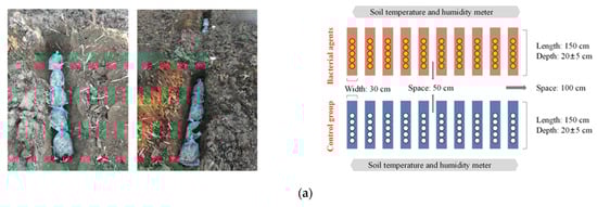 Field test layout and soil environment for bacterial agent assessment. (a) Layout of field tests. Temperature and moisture in different soil layers during (b) 2020 and (c) 2021.