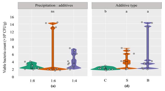When a single additive was used, the bacterial agent had a generally low viable count (Figure 2a,d). Table 2 and Table 3 show the nonparametric analyses of the viable counts of the bacterial agents prepared from different ratios of precipitate to additives and from different additive types. The results revealed that the viable bacterial counts of the bacterial agents with starch and bran as additives were significantly (n = 27, p = 0.024) higher than those of the agents with corn stover powder as an additive, and the differences between the different ratios of precipitate and additive were not significant. The formulation that maintained a relatively high viable count was the bacterial agent with bran as the additive and a precipitate:additive ratio of 1:6 (1.39 × 1010 CFU/g).