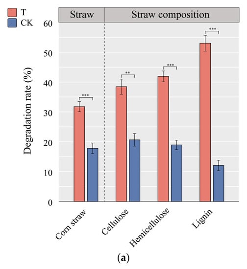Effectiveness of the tested bacterial agents in the laboratory and in field conditions. Degradation rates of corn stover and its components in the (a) laboratory and in field tests conducted in (b) 2020 and (c) 2021. * p ˂ 0.05, ** p ˂ 0.01, *** p ˂ 0.001. T: bacterial agent application treatment. CK: control group.