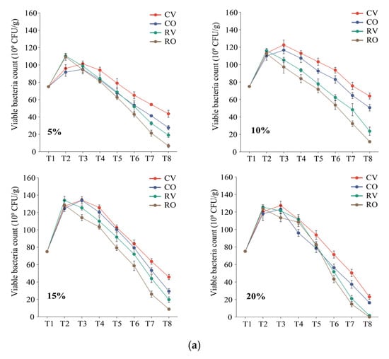 A t-test analysis (Figure 5b) was performed for each treatment to compare vacuum packaging versus ordinary packaging and cold storage versus room temperature storage. We observed that the number of viable bacteria under the cold storage condition was significantly higher than that under room temperature (t = 3.78, p = 0.000), and the viable count under vacuum packaging was significantly higher than that under ordinary packaging (t = 2.76, p = 0.006).