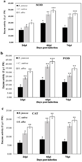 Antioxidant enzyme profiling in B. juncea, C. Sativa, and S. alba after powdery mildew infection. (a) SOD activity in B. juncea, C. Sativa, and S. alba after powdery mildew infection. (b) POD activity in B. juncea, C. Sativa, and S. alba after powdery mildew infection. (c) CAT activity in B. juncea, C. Sativa, and S. alba after powdery mildew infection. Asterisks shows statistically significant (* p < 0.05) or extremely significant (** p < 0.01) or (*** p < 0.001).