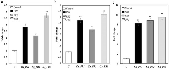 Expression analysis of SA marker genes (PR1, PR2, and PR5) in (a) B. juncea, (b) C. sativa, and (c) S. alba after powdery mildew infection. Error bars based on standard error were calculated from three biological replicates (* p < 0.05; ** p < 0.01). Asterisks shows statistically significant (* p < 0.05) or extremely significant (** p < 0.01) between control and infected plants.