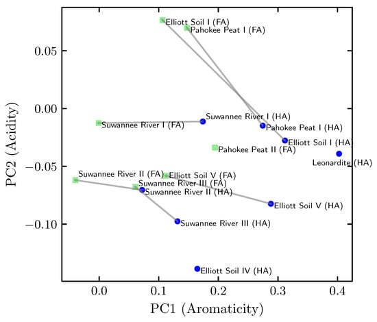A previous PCA analysis by Schellekens et al. [39] of the humic substances resembled the importance of these two components, in their work denominated as aromaticity and solubility. The PCA, in this case, was determined in the process of comparing humic acids and fulvic acids by using Pyrolysis GC MS data. A direct comparison with our results remains difficult. However, our results using the organic composition of HS can determine similar principal components.