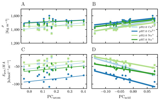 The density () of simulated systems (see Figure 2A,B) permits us to measure the degree of compaction of our systems. The results indicate the close interaction of molecules with high PC, which implies that systems with high carboxyl content have high compaction of the system. Systems at neutral pH present higher compaction than the ones at low pH, for both calcium as well as with sodium, in agreement with our previous results [16]. This reveals the importance of the protonation state of the carboxyl groups in the compactification process. Between the two types of cations, systems neutralized with calcium lead to a higher density than systems containing sodium ions. This indicates the role of ions in the system structure, also demonstrated later with different analyses.
