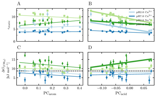 Another property related to the effect of charged species in the system is the free energy of inserting a methane molecule (see Figure 4C,D). This parameter permits us to identify the hydrophobicity of the modeled systems as a function of the PC and PC by inserting multiple times a methane molecule in random places of the whole system [31]. Interestingly, there is no correlation between the first PC (PC) and the of the insertion of a methane molecule for the different humic substances. However, there is a positive correlation with the PC of the humic substances, which indicates an unfavorable insertion of methane with higher PC. This phenomenon is observed in systems composed of sodium ions and neutral pH. It can be attributed to the high concentration of sodium ions in the system, which are with high PC, homogeneously distributed in the simulation box, which results in the insertion of a methane molecule to the system being more unfavorable. This could explain too why the systems with calcium ions have a lower value of .