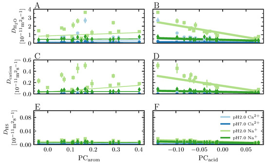 Diffusion of the standard humic substances models as a function of their PC and PC. Plots show the diffusion of water molecules (A,B), cations (C,D) and humic substances (E,F) in function of their PC and PC. Each point represents the average over four independent simulations with error bars representing the standard error. Notice the different y-axis scales in these plots.