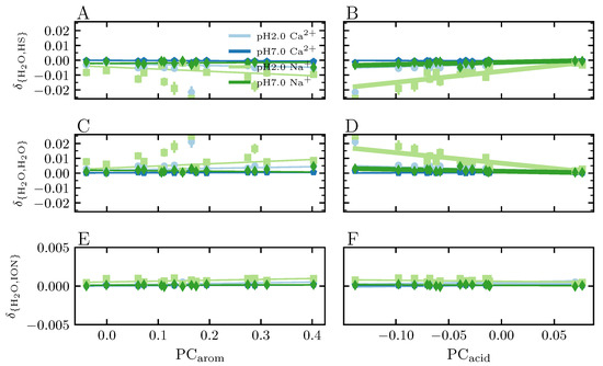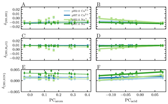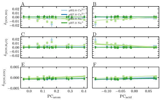 As expected by our previous experiment, the PC content correlates with most of the energetic contributions of nonbonded interactions per pair of interactions. One exception is the interaction between humic substances and water (see Figure 3G,H) in the presence of calcium as counterion, indicating that calcium does not affect the interaction of these two species. Additionally, there are correlations with the PC and the energy between ion and water molecules at acidic pH (see Figure 3I,J), indicating that acidic systems, with more protonated carboxyl groups, indirectly affect the interactions between ions and water, possibly via hydrogen bonds, as suggested in our previous work [16].