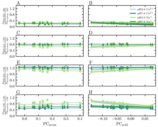 Number of hydrogen bonds of the humic substances models normalized by the number of heteroatoms as a function of their PC and PC. Number of hydrogen bonds between humic substances normalized by the number of heteroatoms of humic substances (A,B). Number of hydrogen bonds between humic substances and water molecules normalized by the number of heteroatoms of humic substances (C,D) and normalized by the number of heteroatoms of water molecules (same as the number of water molecules) (E,F). Number of hydrogen bonds between water molecules normalized by the number of water molecules (G,H). Each point represents the average over four independent simulations with error bars representing the standard error.
