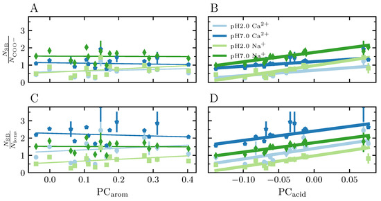 The number of salt bridges between humic substances and cations normalized by the number of carboxyl groups of humic substances (see Figure 10A,B) show a correlation with the PC of the humic substances. This particular graph resembles the preferential solvation of humic substances by ions (see Figure 6F). However, this analysis adds more information about the connectivity of the carboxyl groups. For neutral and acidic pH, each deprotonated carboxyl group is able to interact closely with one cation and this value increases with the PC of the humic substances. Such an increase is also observed at low pH because of the high number of carboxyl groups.