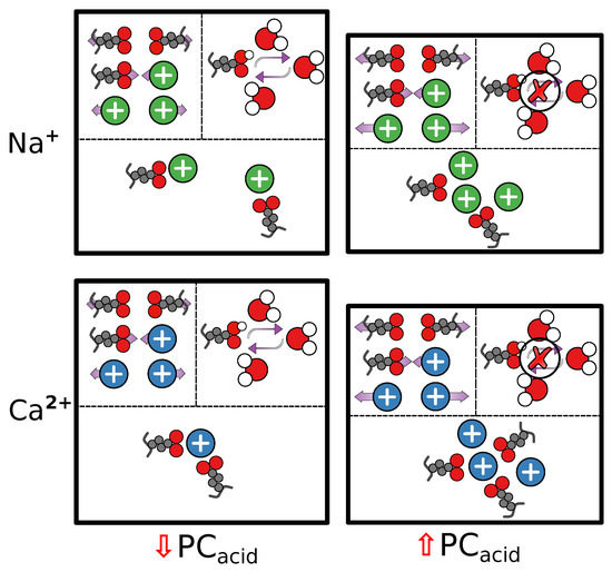 In contrast, the number of hydrogen bonds between water molecules normalized by the number of heteroatoms (see Figure 9G,H) shows a negative correlation with PC. This indicates that low protonated carboxylic content permits water molecules to interact with each other, in agreement with a previous work [16]. Possibly due to their interaction in accessible cavities in these kinds of systems. These hydrogen bonds are reduced with high PC, indicating that the presence of an ionic species interferes with the interaction between water molecules.