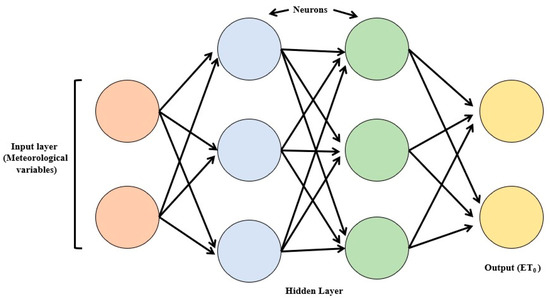 The ANN model comprises multiple interconnected neurons that are organized into layers and connected by weights. It has three distinct layers, namely, the input, hidden, and output layers. The input layer receives the meteorological data while the output layer exhibits ET0. The hidden layer, which is located between the input and output layers, processes the data, and plays a crucial role in handling non-linear data. Each neuron is linked to either the preceding or succeeding layer. The ANN model undergoes multiple rounds of training while adjusting the number of neurons in each layer to prevent overfitting [21,36]. Figure 2 shows the typical three layers in the ANN structure.