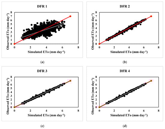 In addition, the comparison between the observed and simulated ET0 values for the DFR model (Cameron Highlands station) is presented in Figure 3. The best result was observed for DFR 4 (scenario 4), where all of the data points occurred along the trend line. In comparison, the data points showed more scattering for DFR 1 (scenario 1), indicating the worst performance. Overall, the DFR model demonstrated a slight tendency for ET0 overestimation. For the Cameron Highlands, the DFR model overestimated the ET0 values ranging from 0.13% to 0.91% for all scenarios.