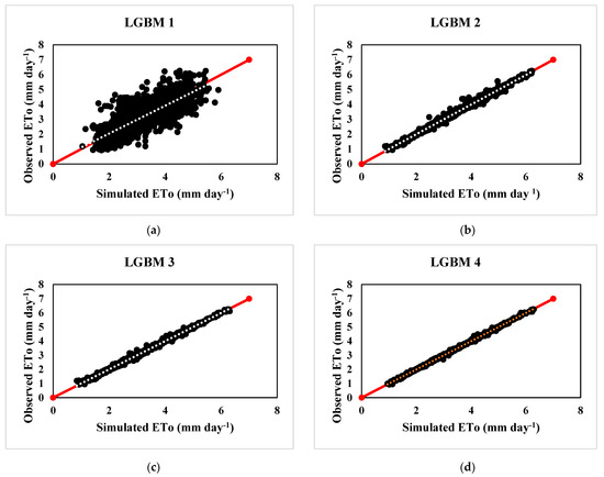 Comparison of the daily observed and simulated ET0 by LGBM model; (a) LGBM 1; (b) LGBM 2; (c) LGBM 3; (d) LGBM 4. (Cameron Highlands station).