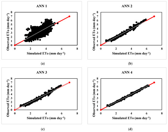 It could be observed that ANN 4 (scenario 4) achieved the best result in Figure 5d, as all of the data points occurred along the trend line. In contrast, ANN 1 (scenario 1) showed the worst performance, as the data points were more scattered in Figure 5a. Overall, the ANN model demonstrated a slight tendency for ET0 overestimation. For the Cameron Highlands station, the ANN model showed a slight underestimation in scenario 1 (3.05%) and a slight overestimation in scenarios 2, 3, and 4 (0.26−0.45%).