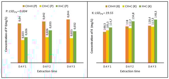 The potassium concentration of H+C was different from that of CH+C and CH+H treatments. The interaction between treatment and extraction days shows no significant difference in K concentration of day one and day two, day two and day three of CH+H, while day three was different from day one. In CH+C, the interaction showed no significant difference in all extraction days. However, in H+C, there was a significant difference in K concentration of the interaction between treatment and extraction days on day one and day two. Wherein day two and day three were the same, but day three was different from day one. Basically, the effect of aeration on P and K concentration was not as discernible as it was on NH4−N and NO3−N contents. This may be due to the lack of volatile-loss pathways for P or K, which resulted in these nutrients being highly conserved [38]. The concentration of K increased in all treatments throughout the extraction; therefore, three days (72 h) can be used to extract K from vermicompost teas.