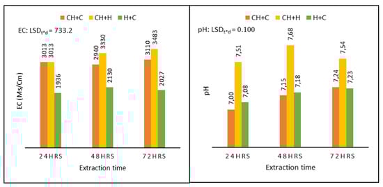 The pH was significantly different in treatments, but the pH in CH+C and CH+H was not significantly different. The interaction between treatments and extraction time shows that pH was different, but in H+C, it was the same throughout extraction. Though it was increasing, it was not significant. In CH+C and CH+H treatments, pH decreased on day three though it was not that significant from day two. However, in all treatments, the pH values were above 5.3, the standard recommended lower limit for irrigation water to be used in vegetable container production systems [42]. Therefore, there is a need to add an acid to lower the pH to the required standard. With the required adjustments, two days (48 h) can be used to extract EC and pH from vermicompost teas.