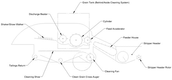 The basic concepts and techniques employed in harvesting equipment have not changed much in the last half-century. Specifically, with the advent of combine harvesters, the same basic concepts can be found in machines from the 1970s and even earlier. One notable comparatively recent major innovation is the axial rotor combine [8,9]. Other innovations have been related to the headers used by combines to remove the crop from the field [10]. Arguably the most predominant of these is the invention of stripper headers originally developed at Silsoe Research Institute in the UK [11] and commercially manufactured by Shelbourne Reynolds Engineering, Ltd. [12]. A stripper header strips grain from the crop, leaving the stems and majority of material-other-than-grain (MOG) on the field, to reduce the material being ingested into the threshing and separating sections of the combine harvesters [13]. As a result, a greater threshing and cleaning capacity per unit width of the crop harvested was obtained [14]. Despite having a relatively higher header grain loss than other combine header types, the stripper header has many advantages, such as high throughput (up to 17 kg/s), high collecting speed (as fast as 2.2 m/s or 5 mph), reduced fuel consumption, and less demand for maintenance [15,16]. This technology has radically changed the way small grains are harvested.
