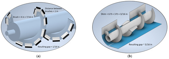 The materials chosen for the two design solutions were selected based on availability and expediency. The brushes used were composed of nylon bristles and a PVC backing material at a length of 1.83 m (6 ft) (Grainger, Lake Forest, IL, USA). The brushes were cut to 101.6 mm (4 inches) wide per piece as this was determined to be adequate for maximizing the effective area the brush filled. Considering the materials and resources available to the project, the PVC-backed nylon brush was selected for its ability to be sectioned, while still being pliable enough to be fastened to the helical auger flighting. Additionally, the PVC backing was structurally sound to handle the oscillatory nature of the forces applied to it in the application. Nylon bristles of a diameter of 0.508 mm (0.02 inch) provide good resistance to wear and abrasion and are effective when used in wet or intermittently hot environments as well. The height of the brush was selected to yield a final theoretical gap of 1.58 mm (1/16 inch) between the tip of the bristles and the auger pan, which was deemed sufficient considering the size of the wheat kernels. The distance between adjacent brushes was arbitrarily determined at 25.4 mm (1 inch) along the auger flighting direction. The actual gap between two brushes on the bottom of the auger along the width of the header would be 12.7 mm (0.5 inches) considering the auger flighting angle of 60°. The addition of the brushes reduced the gap width and height by 80% and 87.5%, respectively, which yielded an effective gap area reduction of 70%.