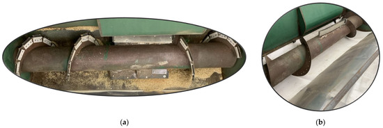 Prototypes of each concept were made and prepared for testing. Holes were marked and drilled into the flighting of the infeed auger for mounting the brush sections (Figure 4a). Brush strips were ordered and cut into 101.6 mm (4 inches) sections. These sections were fastened to the auger flighting with two ¼-20 × 1-inch bolts. Great care was taken to not crack the backing of the brushes when tightening. Once installed for the first time, the brush sections were numbered to ensure ease of assembly and disassembly during testing.