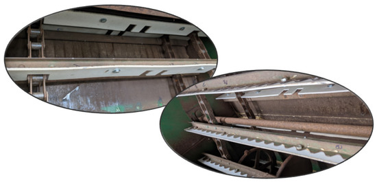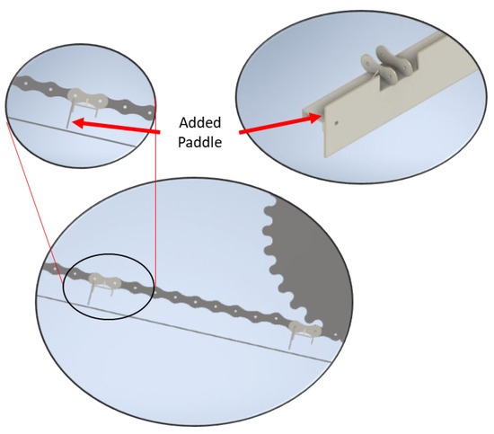 The prototype was constructed using pre-cut paddles with a custom geometry that allowed for clearance to critical components. To create these paddles, careful measurements were taken of the feeder house, including width, height, clearance from the paddle to the floor, clearance to drive and idler sprockets and other chain guides, etc. Installation of the paddles was performed using 4 HHCS ¼-20 × 1-inch bolts. The paddles were fastened to the leading edge of the channel section bars (Figure 6).