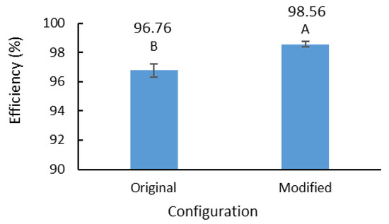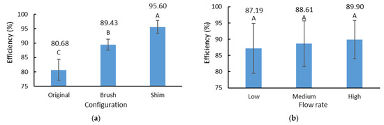 Both the brush and shim concepts significantly improved the material-conveying efficiency of the auger, as compared to the original configuration, regardless of the material flow rate (Figure 8a). The shim concept had the highest material-conveying efficiency of 95.6%, which was significantly higher than that of the brush concept. The shim concept increased the conveying efficiency of the auger by 15% from its original value of 80.68%. In other words, a 15% reduction in grain header loss was achieved by adding the shim to the auger. Similarly, the addition of brushes delivered an approximately 9% reduction in grain loss.