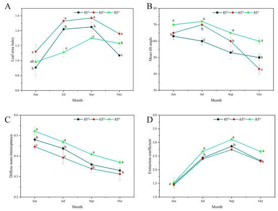 Differences in the canopy characteristics of peach trees with different main branch opening angles. (A) Leaf area index; (B) mean tilt angle; (C) diffuse non-interceptance; (D) extinction coefficient. Within the same period, means followed by different letters are significantly different (p < 0.05).