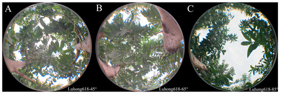 Fish-eye photographs of the canopy at different branch opening angles were taken at the end of August when the canopy was in its final stage of formation. This set of pictures can more visually represent the difference in the visible sky ratio DIFN at different branch opening angles. It is clear from the figure that for ‘Lu Hong 618’, the density of the inner branches and leaves was higher when the main branch opening angle was 65°. The ratio of the visible sky at the bottom of the canopy of 65° was lower than that recorded for 45° and 85°, and the ventilation and light penetration conditions were poor (Figure 3).