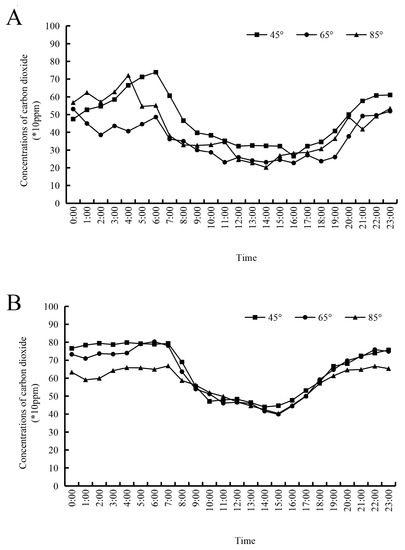 3.3. Daily Variation Pattern of Carbon Dioxide with Different Main Branch Opening Angles